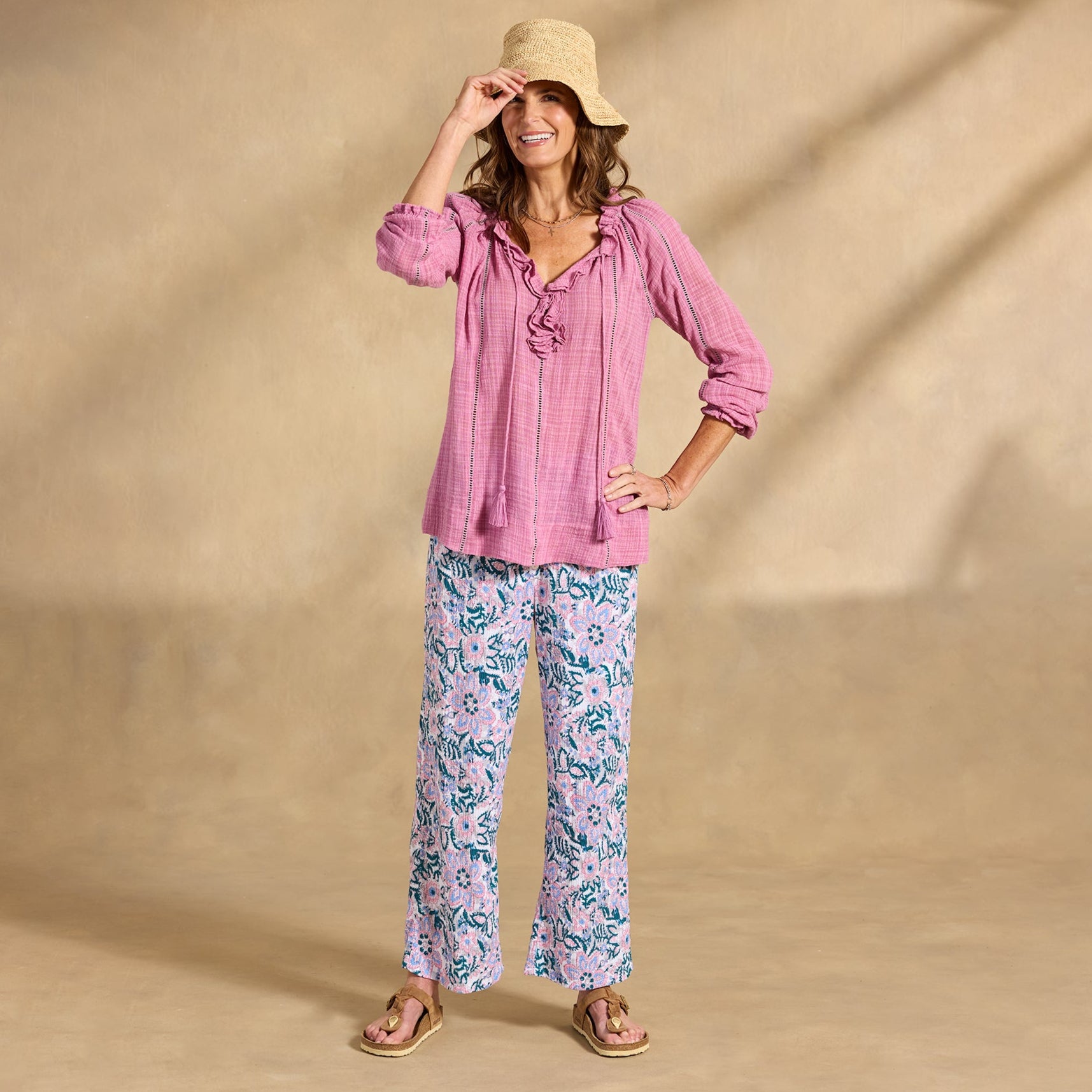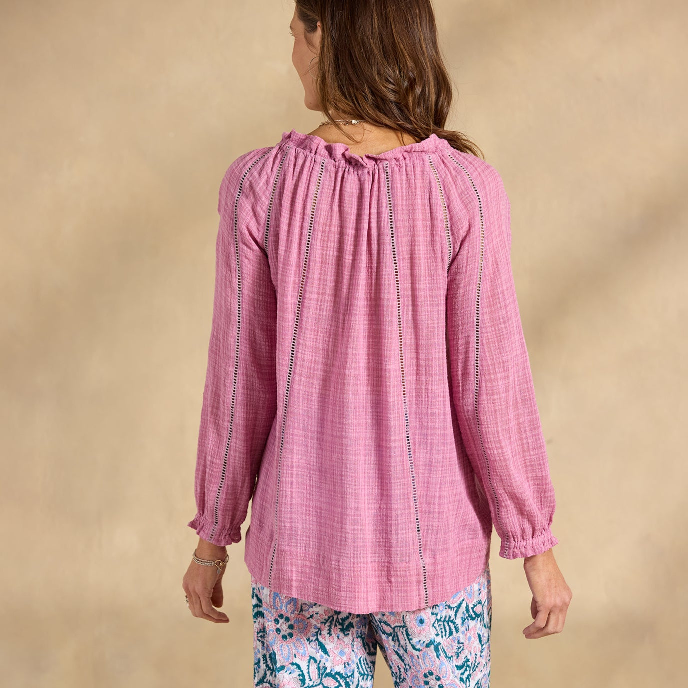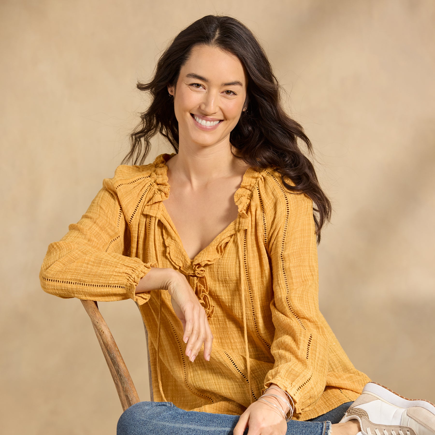 Embrace your artistic spirit in our sheer. easy-fit top with ladder lace. ruffle neckline and tassel ties. Cotton/viscose. Hand wash. Imported. Exclusive. Sizes XXS (00). XS (0–2). S (4–6). M (8–10). L (12–14). XL (16–18). Approx. 24.5l
