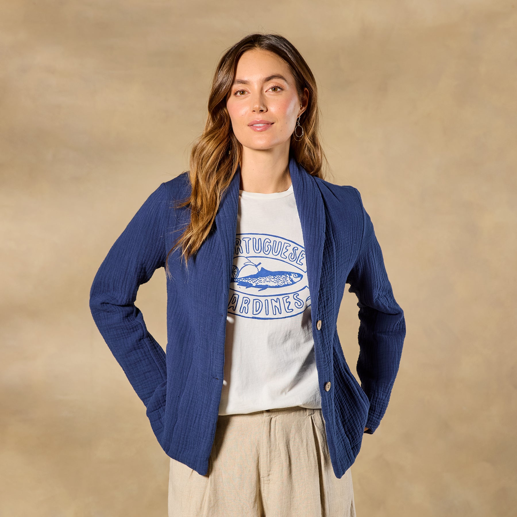 The subtle structure of a blazer PLUS the softness of four-ply brushed gauze: our Blake Blazer really is the best of both worlds. Wear with the sleeves rolled up or down; this classic-fit light layer has a shawl collar. SLASH pockets and wood buttons. CONTENT. CARE. Imported. Sizes XS (0–2). S (4–6). M (8–10). L (12–14). XL (16–18). XXL (20–22). Approx. 23.75l.