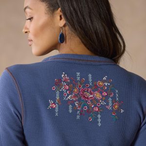 Lovely. multicolored floral and geometric embroidery graces our fitted. notch neck henley with contrast stitching detail. rib trim and princess seams. Metal buttons. Cotton. Machine wash. Imported. Exclusive. Sizes XXS (00). XS (0–2). S (4–6). M (8–10). L (12–14). XL (16–18). Approx. 24l.