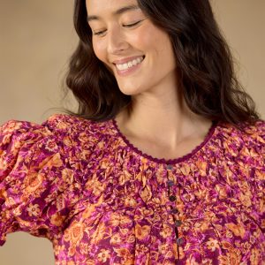 Feminine and textured. our Lodi Top is printed in bold florals with intricate details of lace and pineapple smocking. Button placket with loop closure. Elastic cuffs. Cotton. Machine wash. Imported. Exclusive. Sizes XS (0–2). S (4–6). M (8–10). L (12–14). XL (16–18). XXL (20–22). Approx. 24.5l.