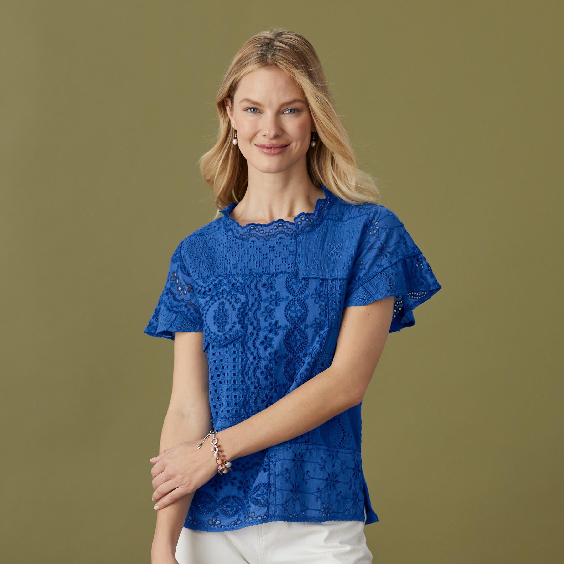 It doesn’t get more romantic than our vintage-inspired. eyelet and lace patchwork top with slight flutter sleeves and scalloped lace at neckline. Mixed media. with woven front and knit back. Cotton. Machine wash. Imported. Exclusive. Sizes XS (0-2). S (4-6). M (8-10). L (12-14). XL (16-18). XXL (20-22). Approx. 24l.