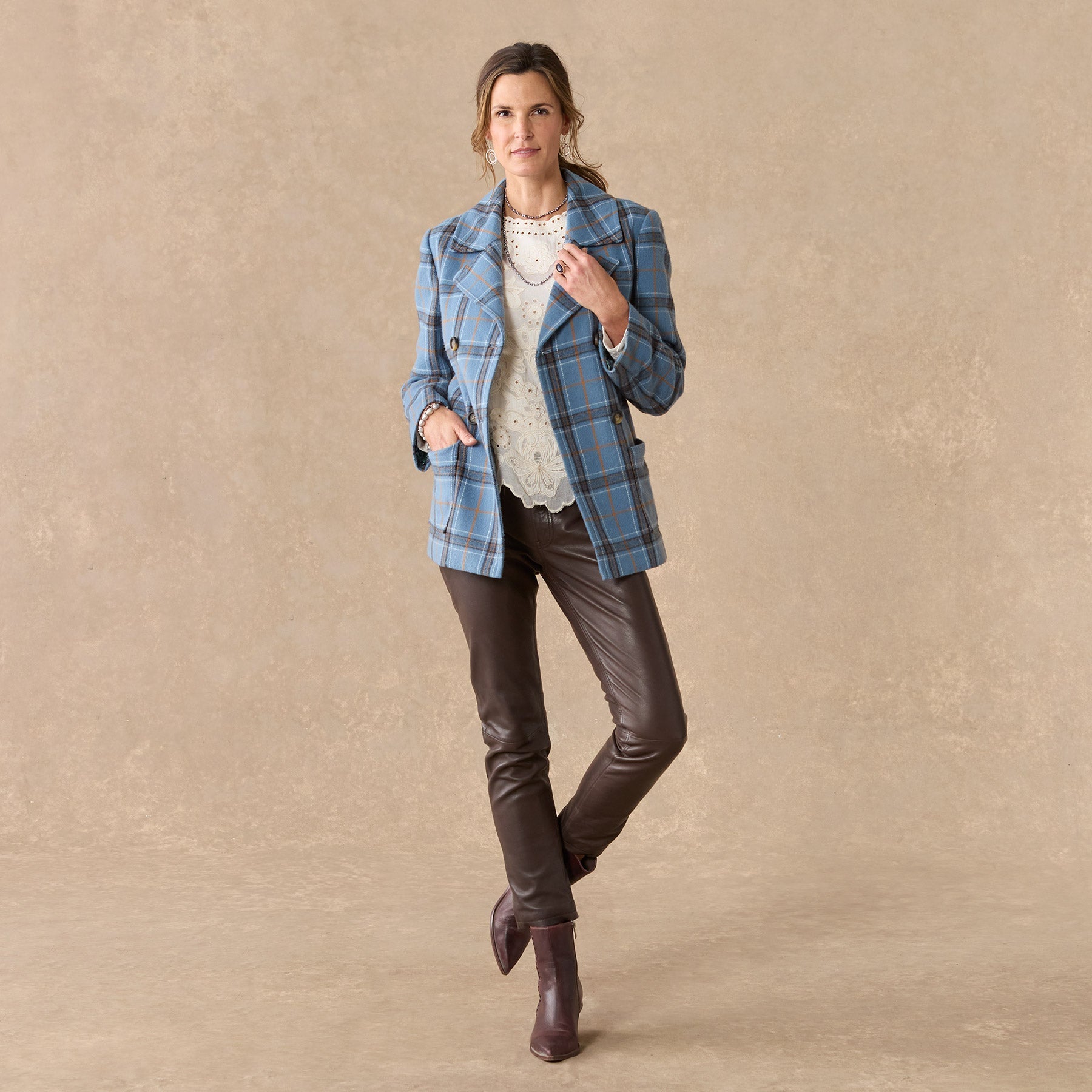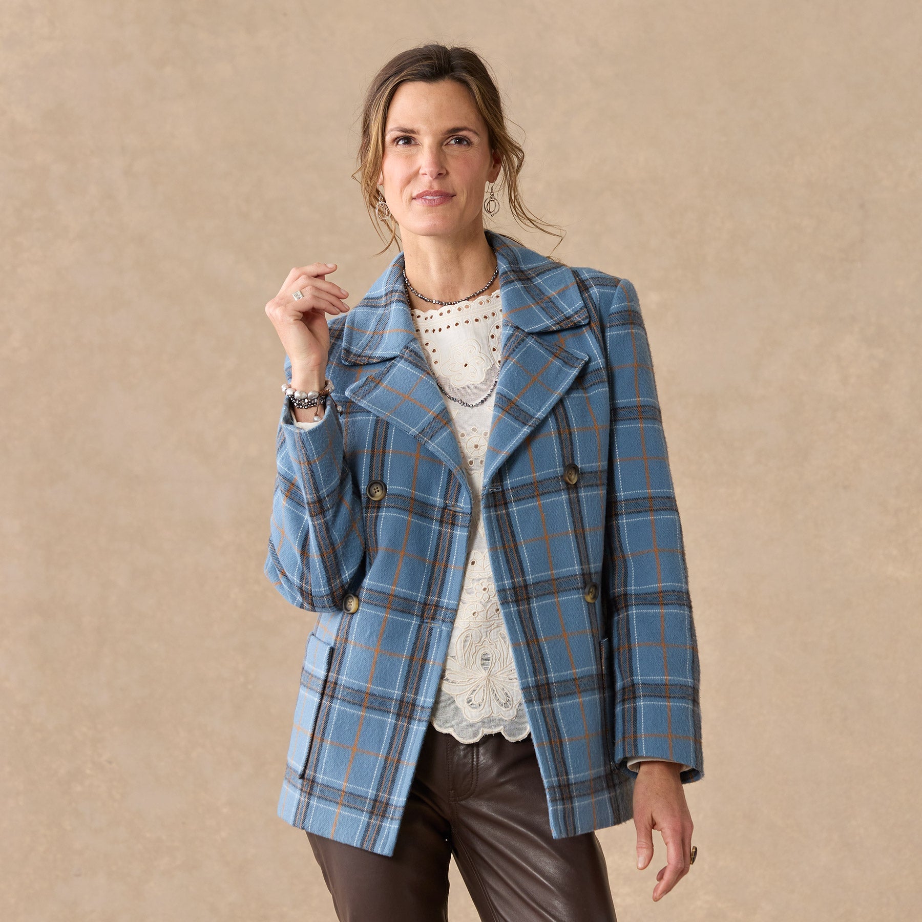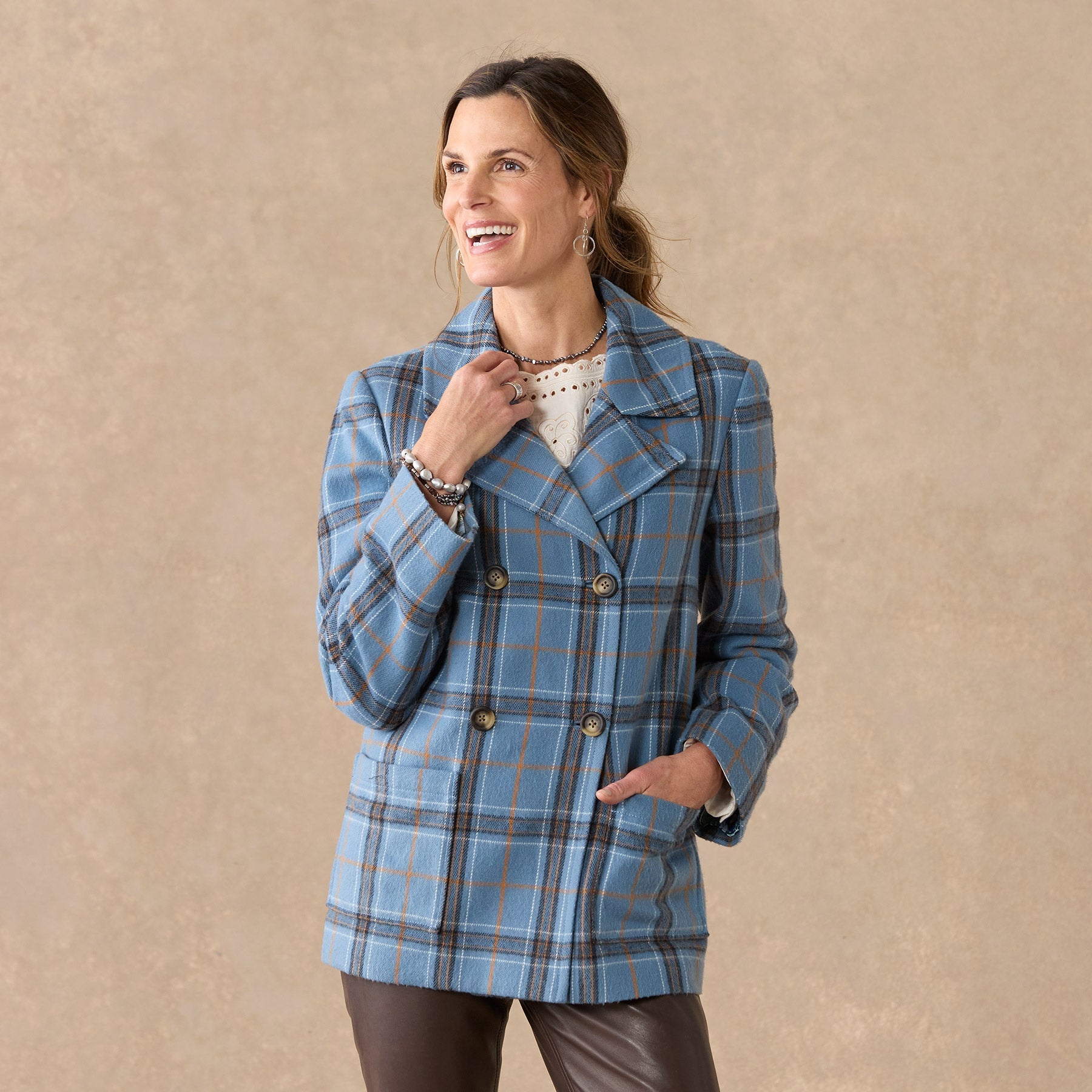 Our smart. brushed flannel plaid pea coat is soft. classic and beautiful. Double breasted. with faux horn buttons. patch pockets and a fun. floral-printed lining. Polyester. Dry clean. Imported. Exclusive. Sizes XXS (00). XS (0??). S (4??). M (8??0). L (12??4). XL (16??8). Approx. 27l.