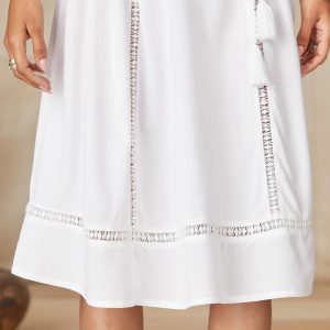 This exclusive. handcrafted dress features embroidered teal medallions on the yoke and sleeves. ladder lacing and a tie at the waist with tassels. Imported. Sizes XS (0-2). S (4-6). M (8-10). L (12-14). XL (16-18). XXL (20-22). Approx. 44l.